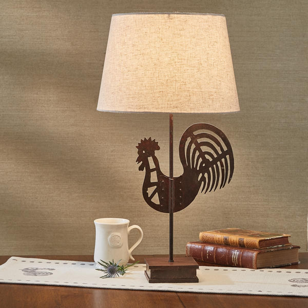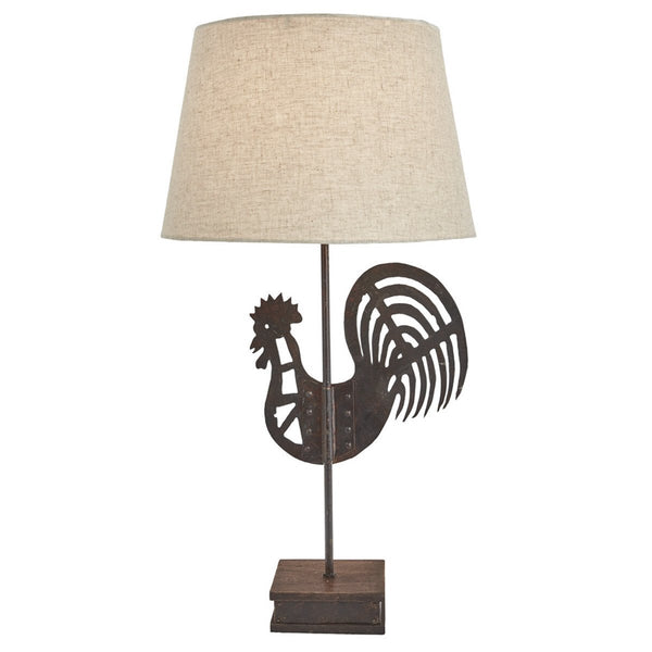 Add farmhouse charm with the Folk Rooster Lamp with Shade by Park Designs. The metal cut-out rooster design is on a fixed rod on a square base. Topped with an neutral, textured shade. The lamp accommodates up to a 100 watt bulb. Light bulb not included. Dimensions: 24.5"H x 5" square base.
