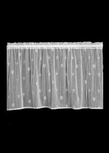 A perfect "decor at the shore" collection, Sand Shell includes window treatments, home textiles and pendant lighting. All feature delicate starfish and seashell motifs on crushed lace, accented with shell trim on curtain hems, lamp shades and the ends of home textiles.In addition to standard-size panels, Sand Shell is also available in custom-sewn window treatments up to 120" long.