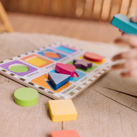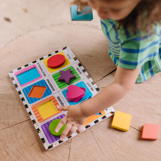- Eight familiar shapes are featured in this extra-thick wooden puzzle with easy-grasp, chunky pieces. Each piece has a matching picture underneath and the shape name is printed on the puzzle board. Encourages hand-eye coordination, fine motor skills and visual perception skills.