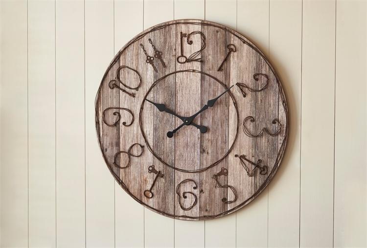 Realistic wooden print clock has metal and antique key accents, that together offer a rustic charm.