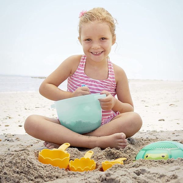 Make fabulous mudpies and sandcakes with this sea-creature inspired "baking" set. Young chefs will love using the shell shaped measuring cups, octopus whisk and crab mixing spoon to "cook" up some great beach treats. The turtle lid on the "mixing bowl doubles as a sifter!