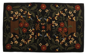 Designed by Carol Endres, multi-layered, hand appliqued garnet flowers with gold centers and warm toast trim spill out of a finely stitched chocolate brown antique basket, while intricately crafted honey bees buzz nearby. Dark sage green leaves add color, while embroidery and French knots add interesting texture to the Penny collection's transitional styled Busy as a Bee rug!