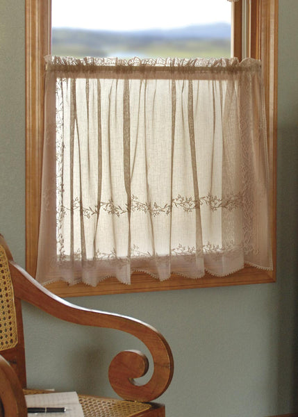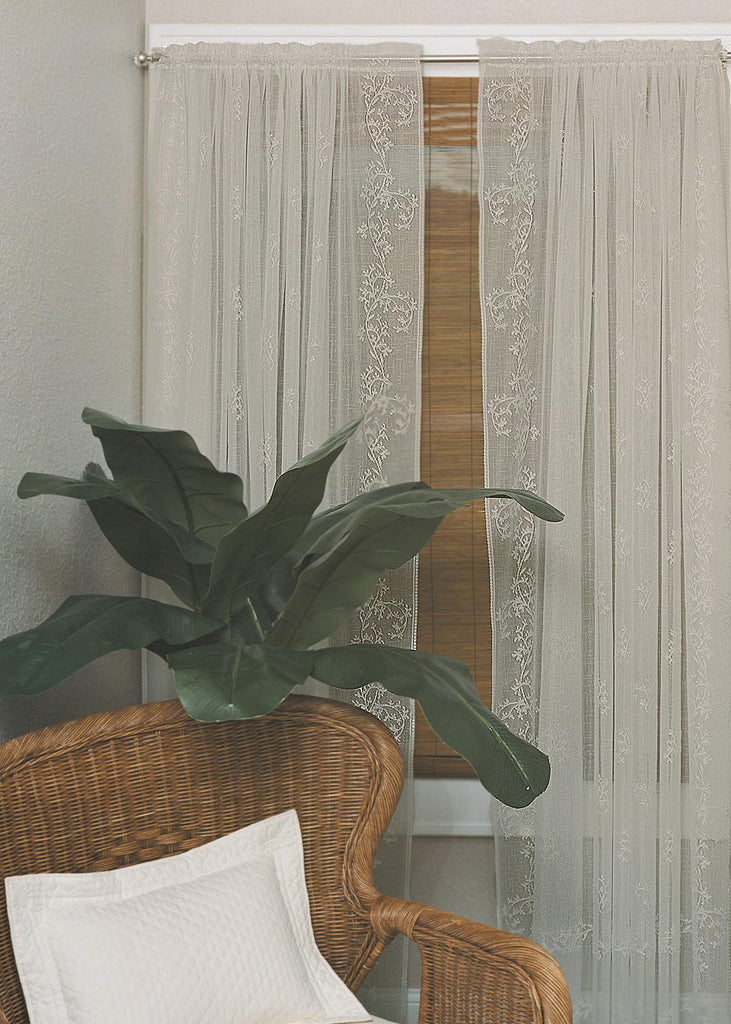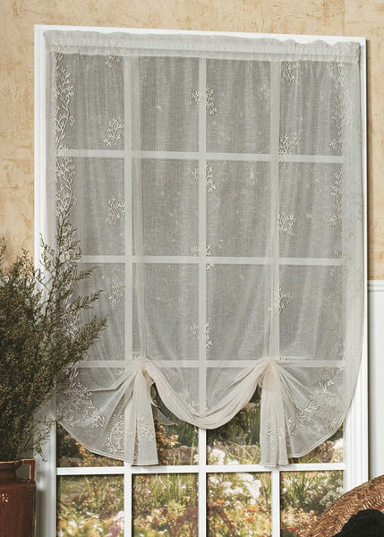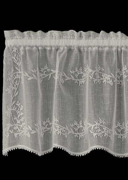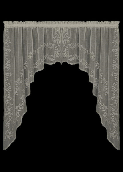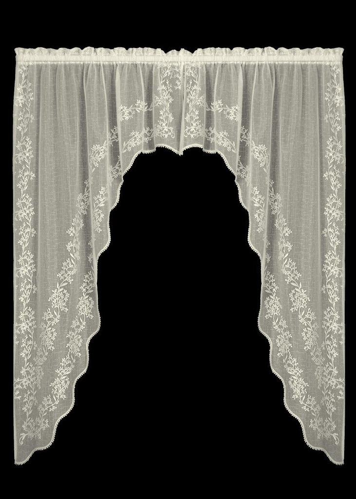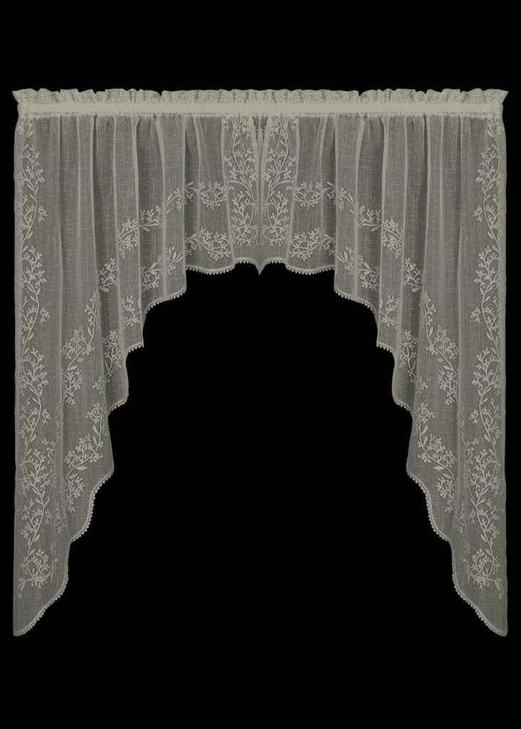The delicate Sheer Divine swag pair lends a light and airy look as it gracefully frames your window. Crafted from the finest clipped lace, this collection of window treatments feature a stunning floral and vine pattern atop a linen like netting. Our lightweight sheer curtains are finished with scalloped edges on three sides. Made in U.S.A.