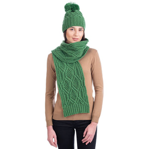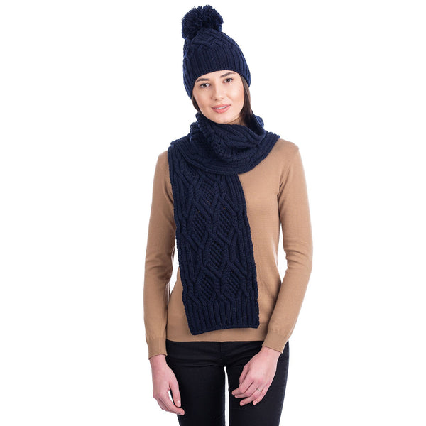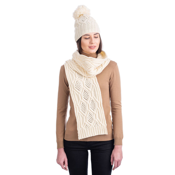 This Ladies Wool Scarf from Irish knitwear company Saol is a beautiful and subtle way to show off your Irish pride. Knit from 100% Merino wool, the scarf is remarkably soft to the touch and elegantly highlights the depth of the detailed knit patterns. These patterns of interwoven diamond, cable, and lace knitting date back over a century and were first developed for use in working Irish fishermen’s sweaters to give an extra layer of warmth while they rowed out on to the Atlantic. Today, they are renowned for their complexity and beauty, while still remaining highly functional by trapping the heat generated from the body and keeping out the cold air on the outside.