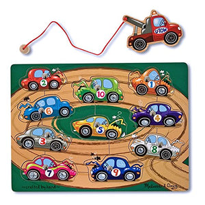 Call the tow truck! This magnetic wooden puzzle game features fun, automotive artwork. Use the magnetic truck to "tow" the ten numbered cars from the game board. Enjoy challenging fun returning the cars to their correct spots! A creative way to encourage eye-hand and fine motor development.