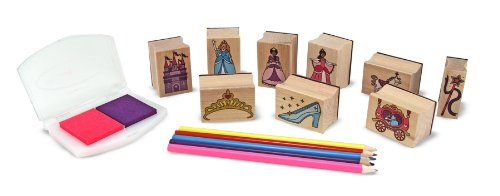 PRINCESS-THEMED WOODEN STAMP SET: The Melissa & Doug Wooden Stamp Set, Princesses, comes with 15 pieces, including 9 stamps, 5 colored pencils, a 2-color ink pad.