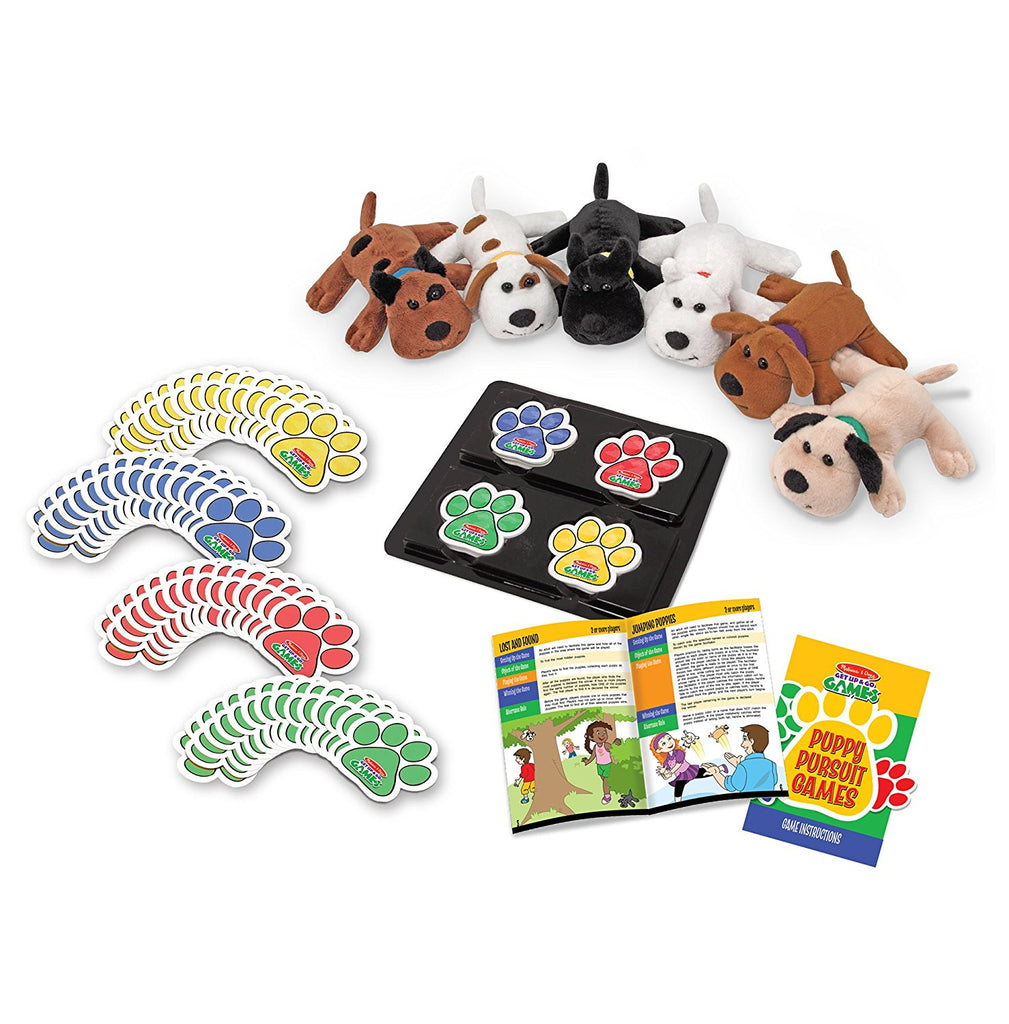 With 6 stuffed puppies and 60 paw-print cards, this box contains 10 active games to encourage the development of memory, patterning, sequencing, color recognition and matching skills. Puppy Hunt, Jumping Puppies and Paw Pickers are just three of the engaging canine-themed activities children will be begging to play! Instructions include variations on many of the games to extend the fun.
