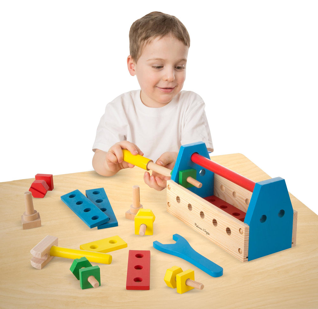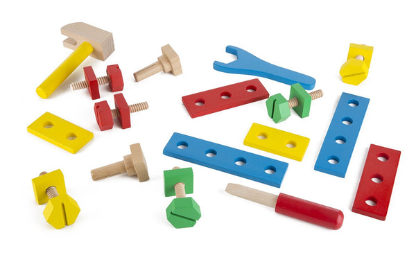 This kit has all the tools young builders need to create projects large and small. Imaginations take flight as children use the easy-to-grip wooden hammer, screwdriver, and wrench to pound, twist, and turn the wooden nuts, bolts, and peg nails, making endless combinations of shapes and patterns. Each new project encourages creativity and independent, imaginative play. With this classic kid-sized tool kit, children are not only playing, but are also building important developmental skills. The hands-on play helps develop fine motor skills, hand-eye coordination, and manual dexterity. As young builders try different ways to connect the brightly colored pieces, they are learning problem solving skills, as well as color and shape recognition, and counting skills. Nails and screws fit into holes in the toolbox itself, or into nuts, bolts, and peg boards that can be connected in various ways. Use the pieces for counting, sorting, and memory games. Pack it all up in the convenient, sturdy toolbox with handle to take playtime anywhere. Children will enjoy endless hours of independent and creative play with this toy.