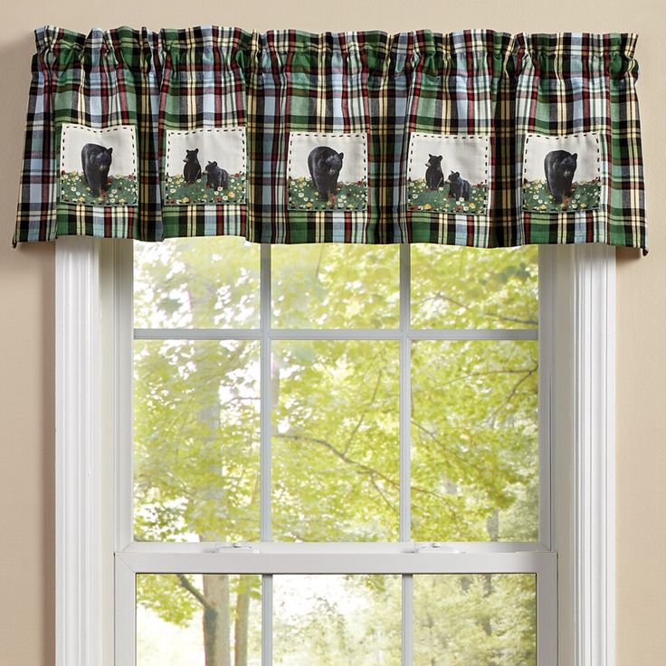 Plaid lined valance in green, black, ivory, red, yellow and blue with printed bear patches. Beautiful!